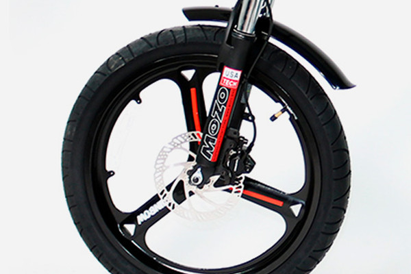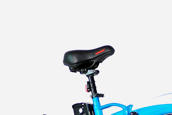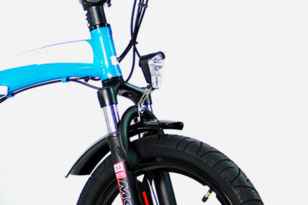 A feature complete folding electric bike, mid-step straight bar or curving step-thru, long telescoping seat post with adjustable suspension element, upgraded suspension fork with lockout and preload adjust, large comfortable one wheel tires, padded grips, and oversized gel saddle smooth out the ride